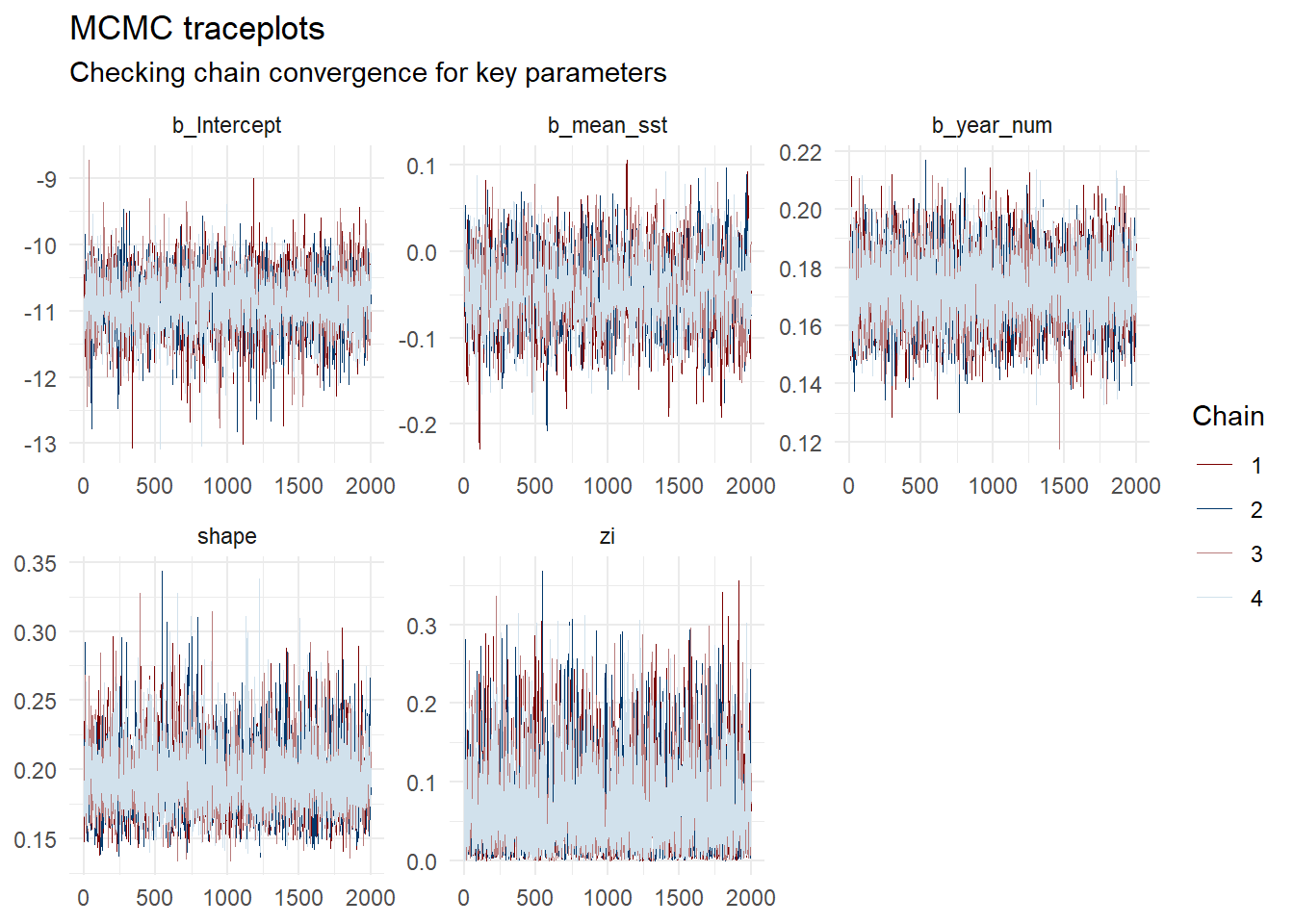 The traceplots demonstrate the sampling behavior of the four independent Markov Chain Monte Carlo (MCMC) chains (represented by different colors) over 2000 post-warmup iterations. For all key parameters, including the fixed effects (b_Intercept, b_mean_sst, b_rok_num) and distributional parameters (shape, zi), the chains are stationary, well-mixed, and tightly overlapping. There are no visible divergent transitions or flatlining, which visually confirms excellent convergence of the sampling algorithm to the target posterior distribution.