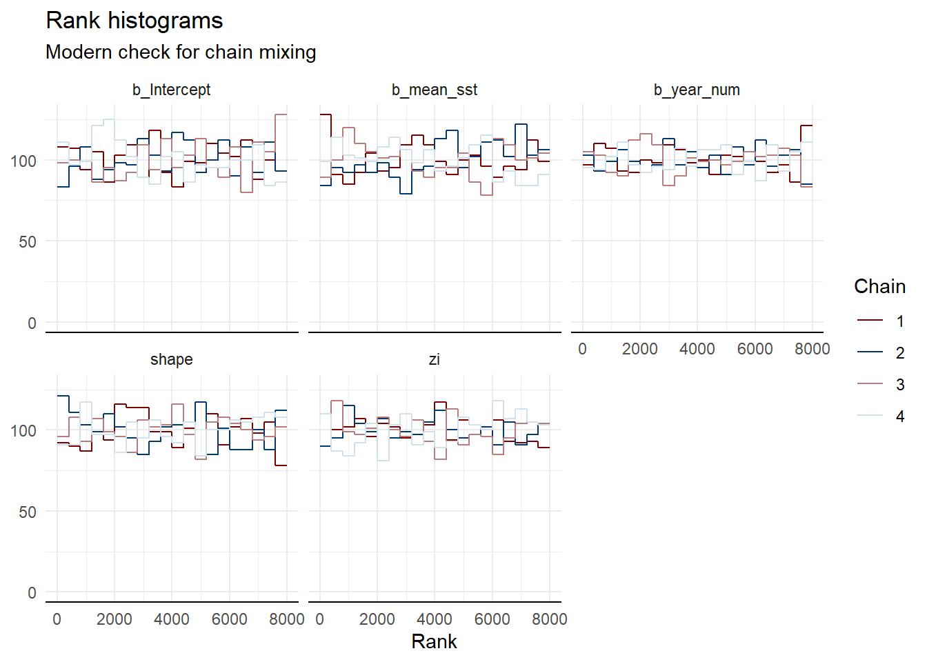 Rank histograms provide a modern diagnostic for assessing MCMC chain convergence. The plot shows the distribution of ranked posterior draws across the four chains. For all evaluated parameters, the rank distributions are approximately uniform, and the chains overlap almost perfectly without any single chain dominating specific rank percentiles. This provides strong evidence that all chains have explored the same parameter space efficiently and achieved proper mixing.