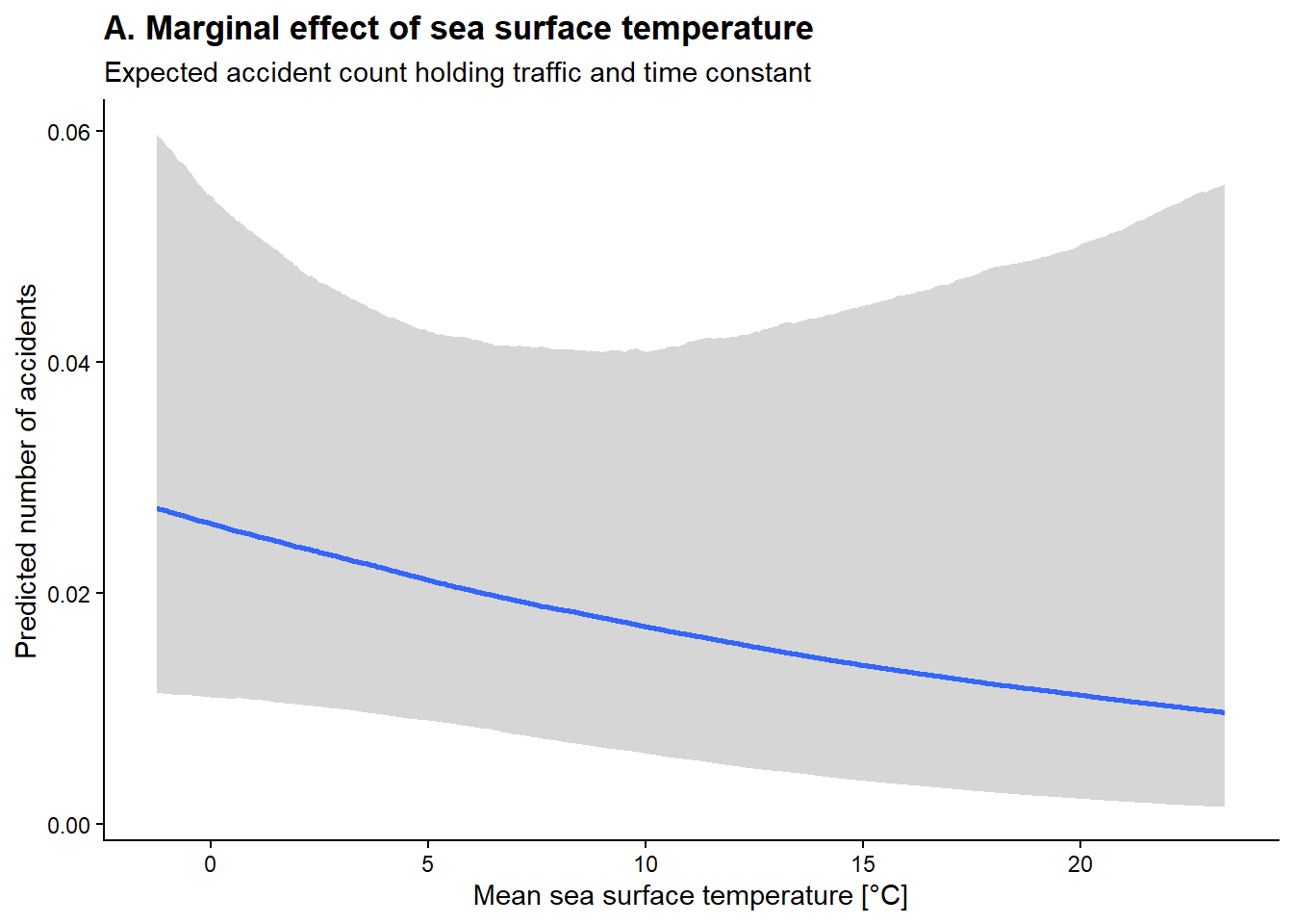 Figure S4. Conditional effect of sea surface temperature (SST). The plot illustrates the marginal effect of SST on the expected number of maritime accidents per grid cell, with all other predictors held at their reference levels and the traffic offset held at its median. The shaded area represents the 95% Bayesian credible interval. Although a slight downward trend is visible, the wide credible intervals encompassing zero indicate no substantial, independent thermal effect, supporting the hypothesis that modern navigational technologies effectively mitigate freezing-related risks.