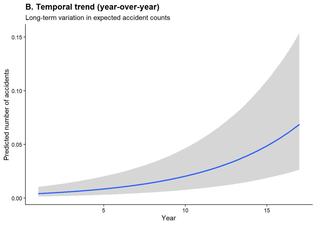 Figure S5. Long-term temporal trend of accident risk. The partial dependence plot displays the estimated continuous effect of time (year_num) on accident frequency. The visible, credible upward trajectory indicates a systematic, underlying increase in baseline accident risk over the studied period (approx. 18.5% year-over-year). This increase is independent of fluctuations in vessel traffic volume, pointing toward external latent factors such as fleet aging or increased reporting strictness (e.g., EMSA EMCiP implementation).
