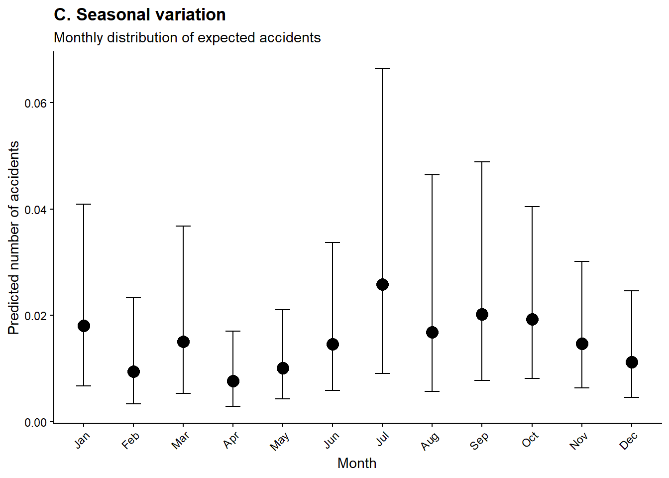 Figure S6. Seasonal variations in expected accident counts. Point estimates with 95% credible intervals showing the isolated effect of specific months on accident probability. January serves as the high-risk baseline. Paradoxically, peak icing months (February, April) exhibit a substantial drop in baseline risk, reflecting the Risk Homeostasis Theory—whereby severe winter conditions prompt risk-compensating behaviors, such as convoy systems and heightened crew vigilance. A secondary peak is observable in summer (e.g., July), driven by distinct mechanisms such as recreational traffic congestion.